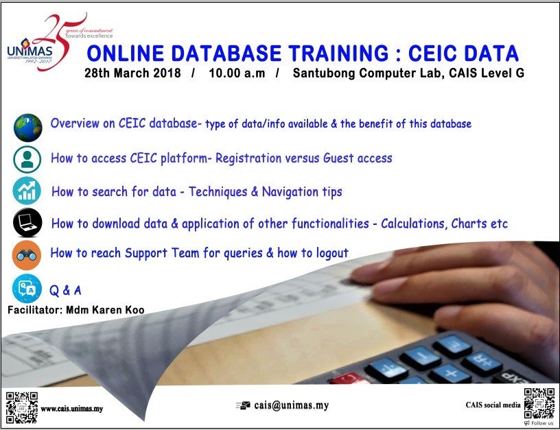 Cais On Twitter Please Be Informed That Cais Will Be Organizing A Training On Online Databases Ceic Data Please Refer To The Infographic Below For More Information Unimas Unimas25 Https T Co Srn2duolcz
