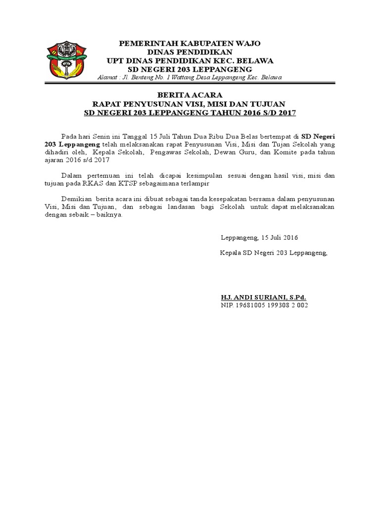 Contoh Berita Acara Daftar Hadir Sk Penetapan Perumusan Visi Misi Tujuan Sekolah Bukti Fisik Akreditasi Sekolah Sd Mi Smp Mts Sma Smk Ma Sk Visi Misi Tujuan