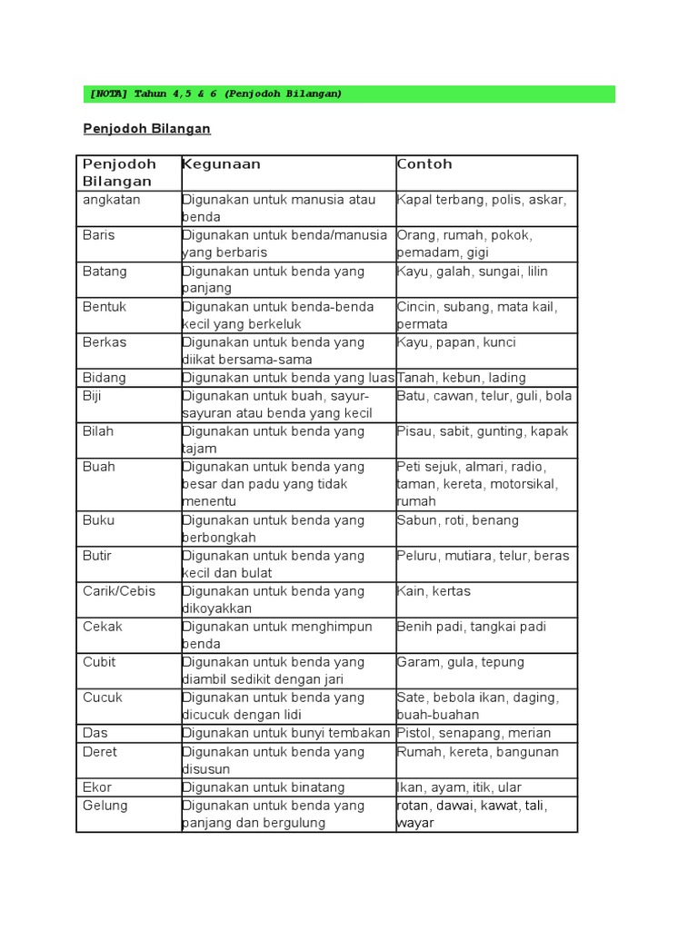 Nota Bahasa Melayu Sekolah Rendah Nota Penjodoh Bilangan