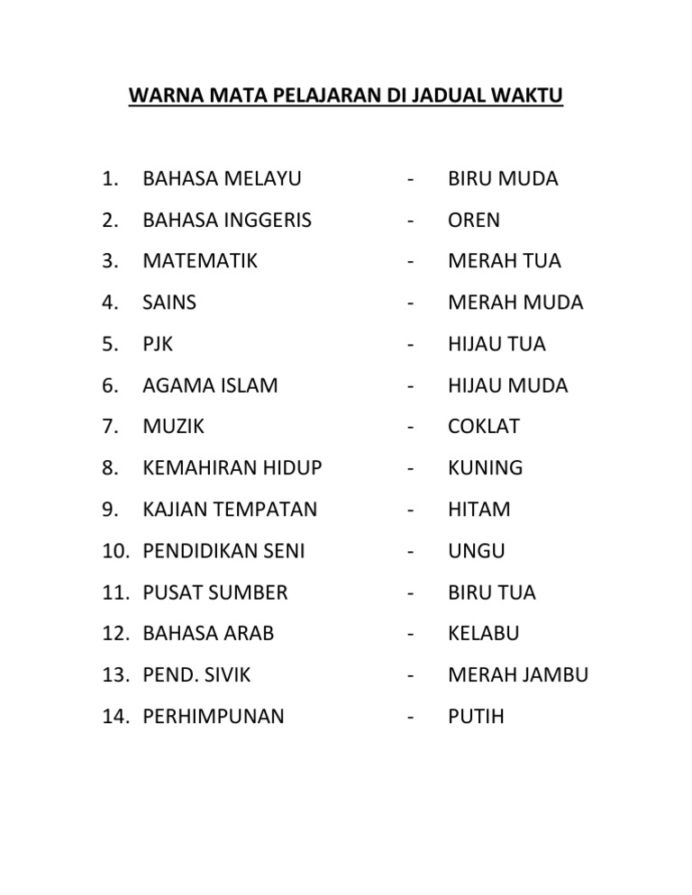 Warna Mata Pelajaran Di Jadual Waktu