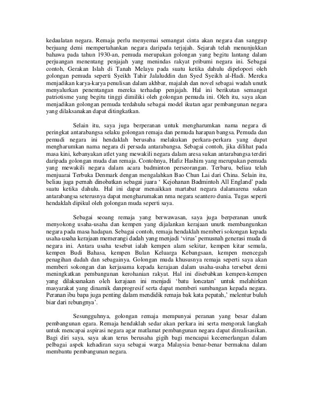 Karangan memupuk semangat cinta akan negara. Lebih tepat kalau dikatakan semangat cinta akan negara dalam kalangan generasi muda kini adalah longgar lemah dan tidak bermaya seperti seseorang yang tidak makan 10 hari. Sebenarnya anak anak merupakan tonggak utama dalam menjayakan visi kudsi wawasan 2020 pada masa hadapan. Semangat cinta akan negara merupakan antara tajuk soalan yang popular untuk digunakan dalam soalan karangan bahasa melayu pelbagai isi dan idea bernas yang boleh diolah oleh pelajar supaya menghasilkan penulisan karangan yang baik. Kaedah ni dapat menggalakkan pelajar pelajar untuk terus mempraktikkan dan memahami sikap semangat cinta akan negara sehingga mereka dewasa.