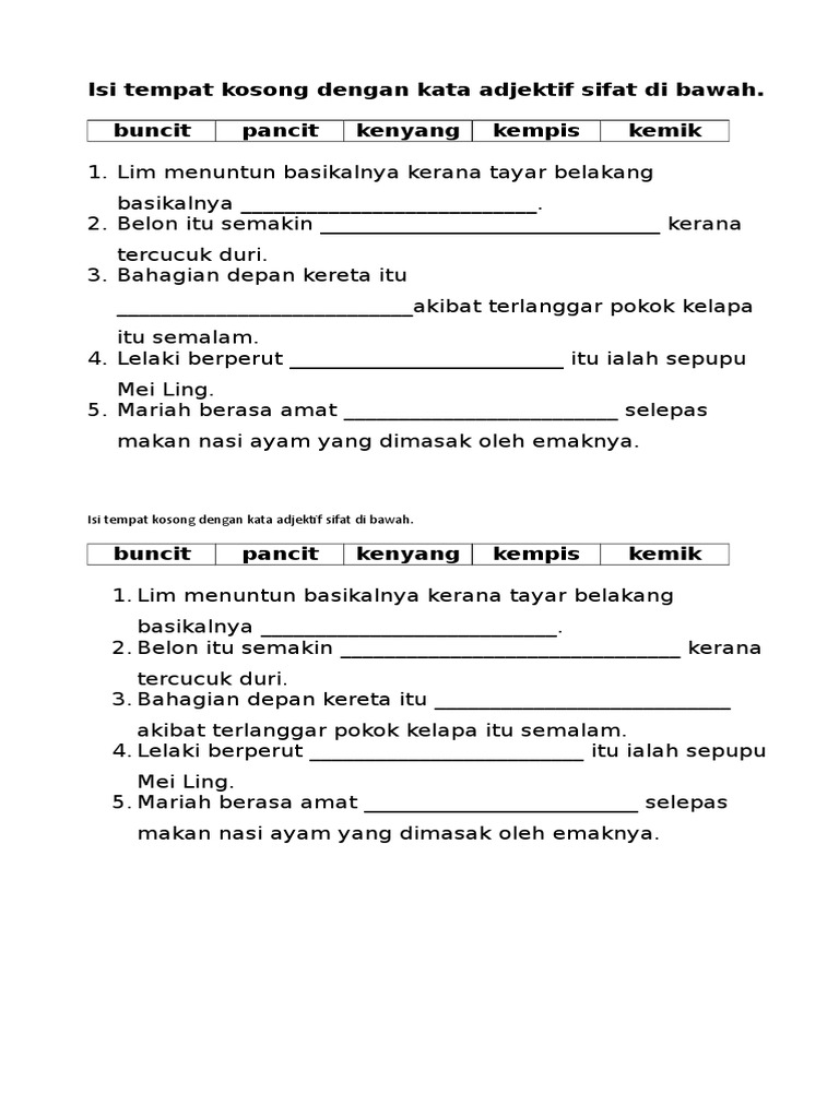 Kata adjektif sifat tahun 2 latihan. Haraplah kandungan dalam blog ini dapat membantu anda memahami dengan lebih teliti dan dapat menguasai kata adjektif. Budak nakal selalu kena marah. Terdiri daripada satu kata adjektif atau beberapa perkataan yang ada kata adjektif. 1 kaki pak senin digigit pacat darah meleleh di kakinya.