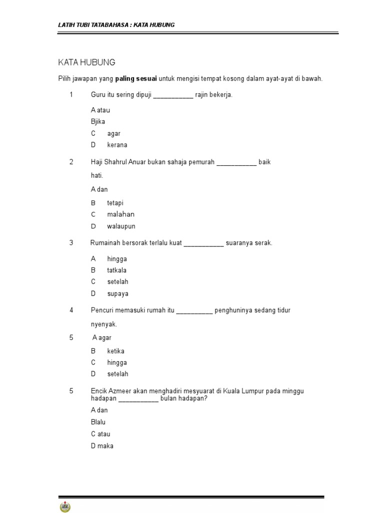 60 Soalan Latih Tubi Tatabahasa Kata Hubung