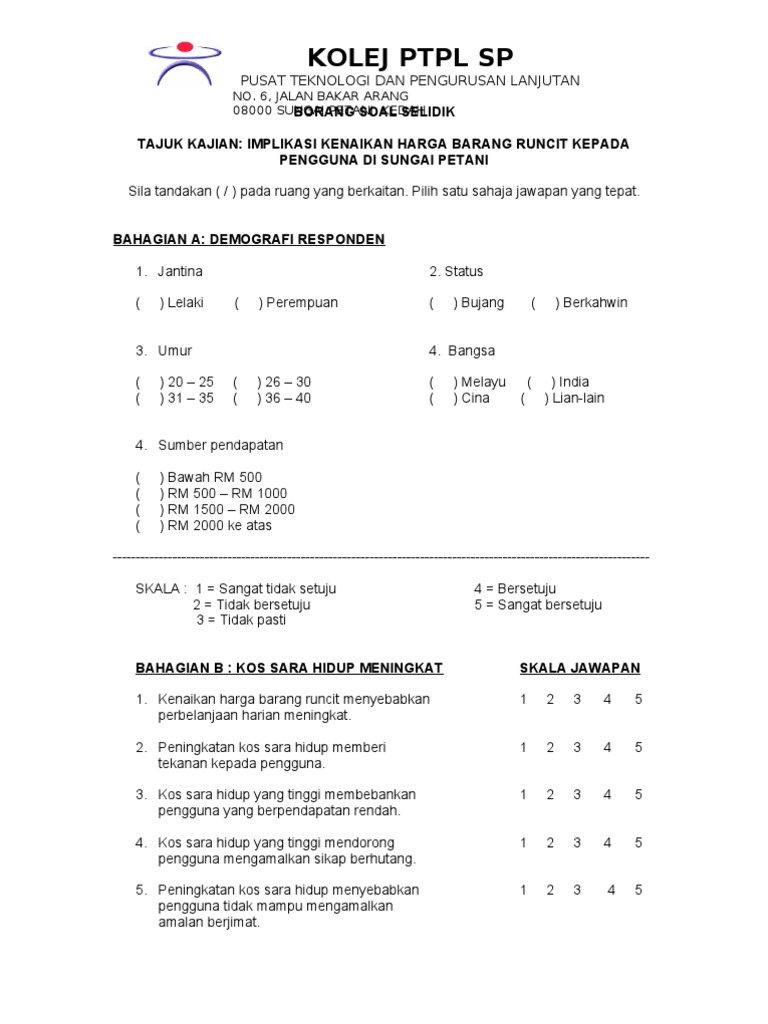 Soalan Contoh Borang Soal Selidik Kunci Ujian