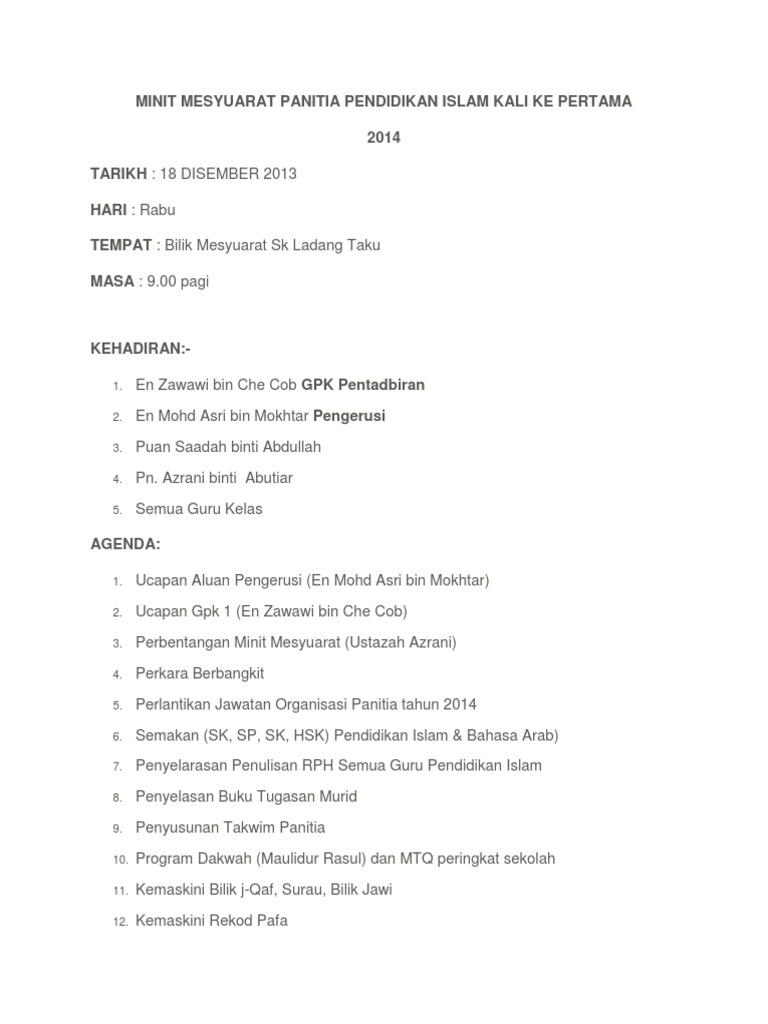 Contoh Minit Mesyuarat Panitia Bm Kali Pertama