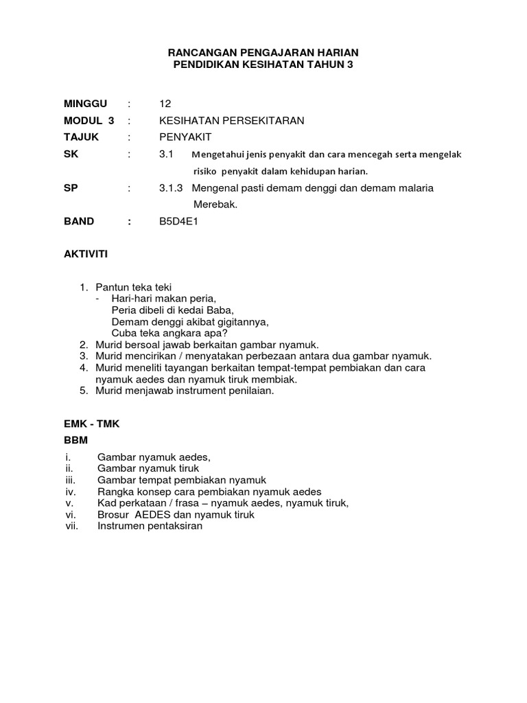 Rancangan Pengajaran Harian Pendidikan Kesihatan Tahun 3