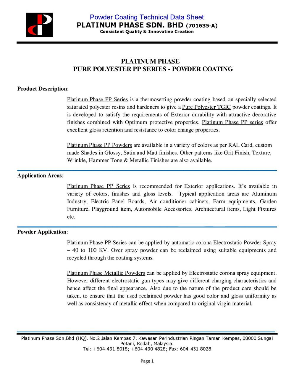 Platinum phase sdn bhd is a privately owned malaysian company has a creative and ambitious management team. Supplier of polyester thermosetting powder coating pure polyester powder coating epoxy polyester powder coating offered by platinum phase sdn. View profile contact info product catalog credit report of platinum phase sdn. Our company commenced its operation in sungai petani kedah malaysia and today we re still located on the original site where it all began.