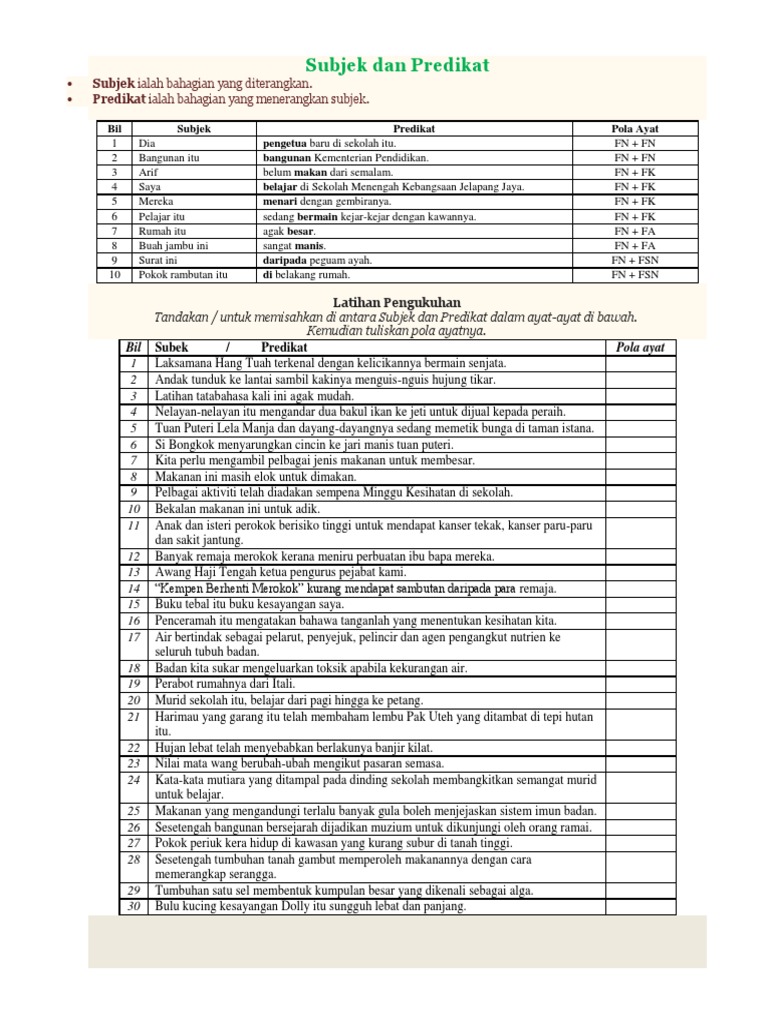 Kenal Pasti Dan Tulis Subjek Dan Predikat Yang Lengkap Bagi Setiap Ayat Seperti Yang Berikut Subjek Predikat