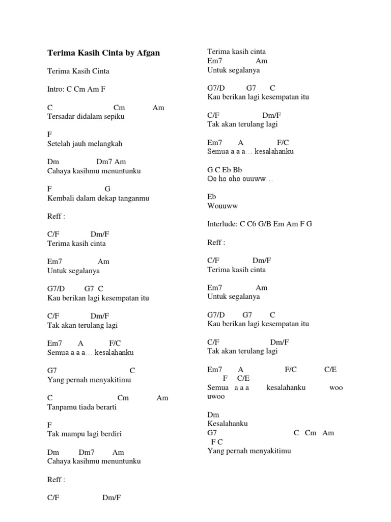 Tribunsolo com chord kunci gitar dan lirik lagu terimakasih cinta afgan. Terima kasih cinta em7 am untuk segalanya g7 d g7 c kau berikan lagi kesempatan itu c f dm f tak akan terulang lagi em7 a f c semua a a a. 2019 wannabmusicproduction artist. 136 657 views added to favorites 1 185 times.